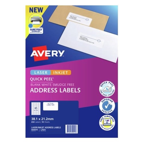 Avery Quick Peel Address Laser & Inkjet Labels White L7651 38.1 x 21mm 140 Labels