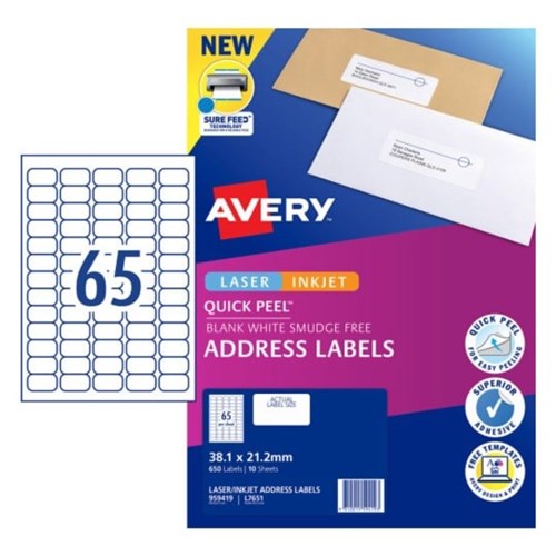 • Size: 38.1x21.2mm 650 labels, 10 Sheets. 65 labels per sheet (65UP).