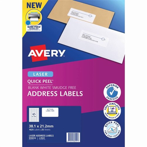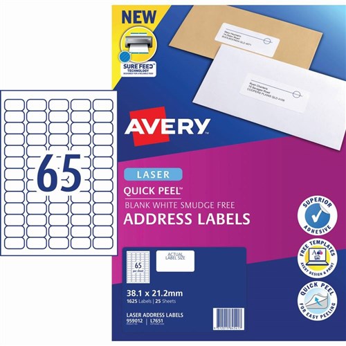 Avery Quick Peel Address Laser White L7651 38.1x21.2mm 65UP 1625 Labels 25 Sheets