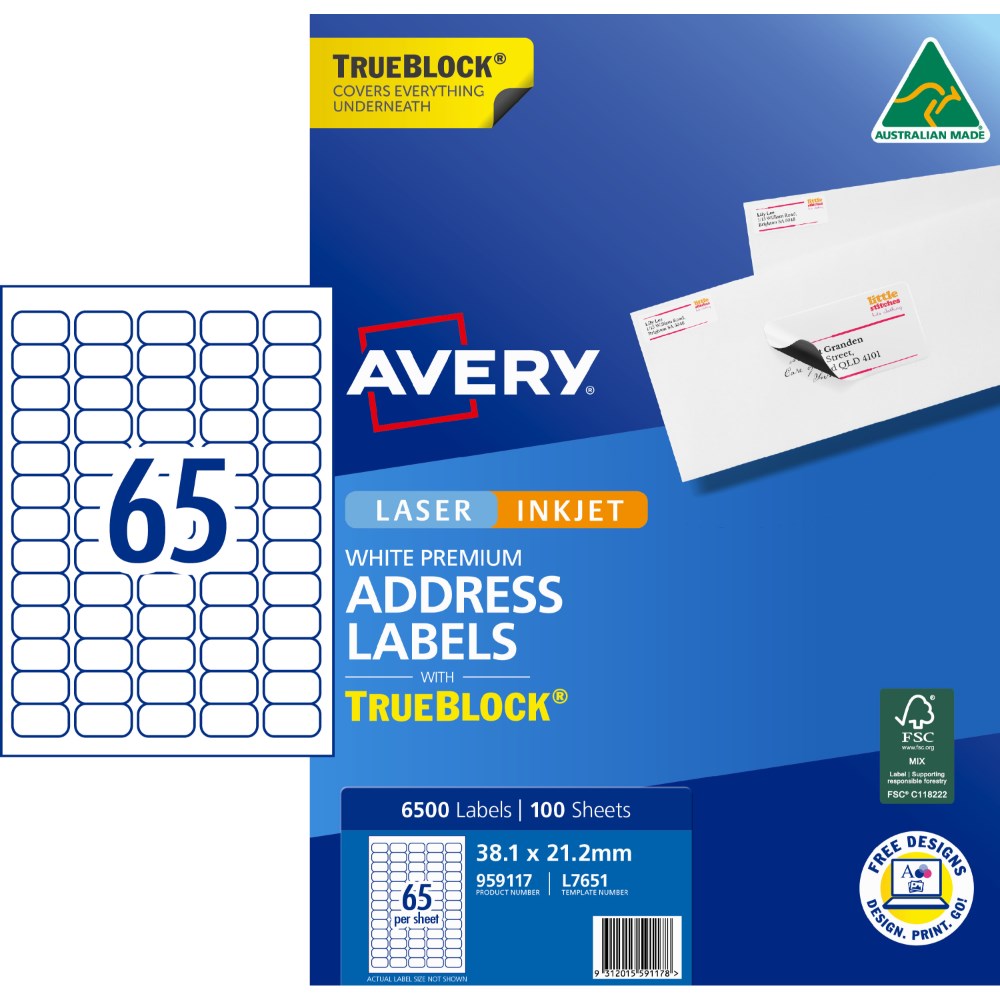 Avery Trueblock Address Labels Laser L7651 38.1 x 21.2mm 65UP 6500 Labels