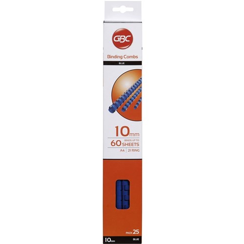 GBC Plastic Binding Comb 10mm 21 Loop 60 Sheets Capacity Blue Pack Of 25