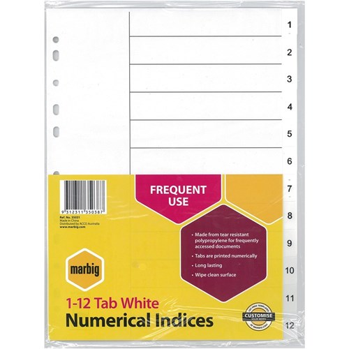 Marbig Plastic Indices & Dividers Tabs A4 1-12 White