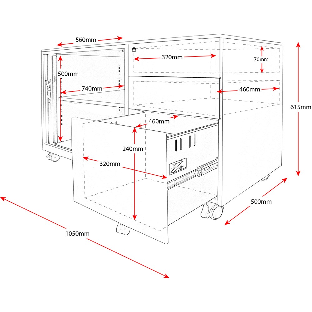 • Internals: Tambour Size 560W x 740D x 500H, Top two drawers 320W x 460D x 70H, Bottom filing drawer 320W x 460D x 240H.
