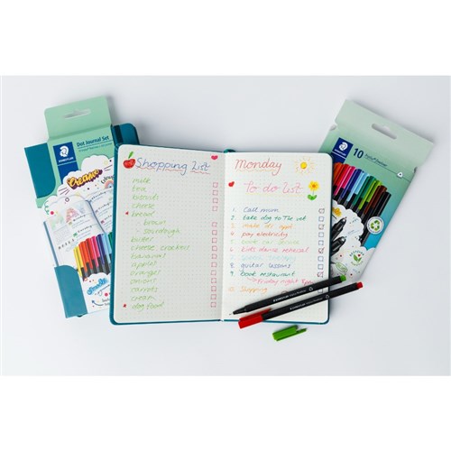 • Includes one 192 page dot journal made from premium vegan leather with a pack of 10 Staedtler triplus fineliners in assorted colours.