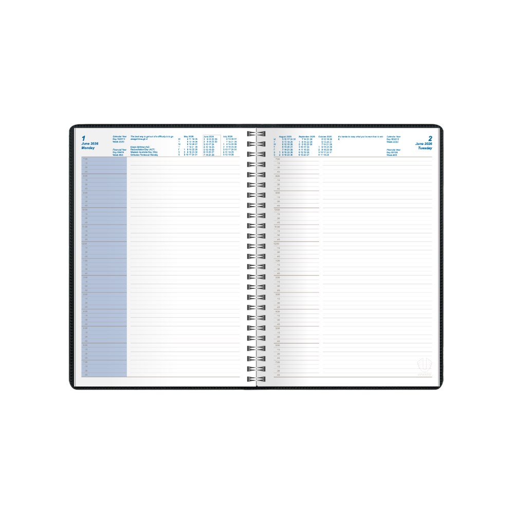 • Featuring a padded, phthalate free, PVC cover, pockets for storing business cards and wire-o binding to allow the diary to lie completely flat when open.